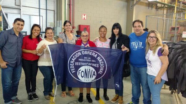 Cristina Apes e Jose Luiz, ambos dirigentes do Sindicato dos Trabalhadores da Indústria do Vestuário da Argentina (SOIVA), participaram de reuniões temáticas para a troca de experiências. Eles visitaram a planta da Comask (empresa que conta com todos os processos do setor de confecções) e integraram uma ação sindical junto aos trabalhadores da fábrica Neide Belline.